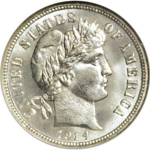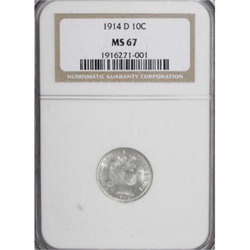 <B>1914-D 10C MS67 NGC.</B></I> The 1914-D is among the nicest and most available Barber dimes in Mint State, although few approach the technical near-perfection of the present piece. This silvery, lustrous Superb Gem displays frosty surfaces throughout, and as expected, there are no remotely relevant marks. Census: 4 in 67, 0 finer (1/08).<BR><I>From The Southwest Collection.</B></I><BR><BR><B>Coin Engraver:</B> Charles E. Barber<BR><BR><b>Shipping:</b> Coins & Currency (<a target="_blank" href="http://www.heritageauctions.com/common/shipping.php">view shipping information</a>)