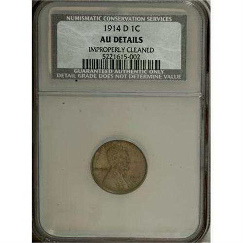 <B>1914-D 1C --Improperly Cleaned--NCS. AU Details.</B></I> This key date cent has only a whisper of friction on the jaw and cheekbone. The mottled chestnut and olive-green color appears a bit too light, but many collectors would cherish its sharpness and smooth surfaces.<BR><BR><B>Coin Engraver:</B> Victor D. Brenner<BR><BR><b>Shipping:</b> Coins & Currency (<a target="_blank" href="http://www.heritageauctions.com/common/shipping.php">view shipping information</a>)