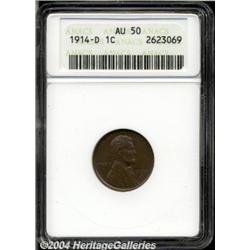 <B>1914-D<1C> AU50 ANACS.</B></I> A glossy chocolate-brown key date Cent with a couple of small and faint spots but no relevant marks. In better circulated grades, tougher than the lower mintage 1909-S VDB and 1931-S issues, since fewer pieces were hoarded.<BR><I>From The Dennis Gundy Collection.</B></I> <BR><BR><B>Important notice:</B> Heritage usually auctions material at the rate of 200-250 lots per hour. On some occasions eBay Live bid software or the Internet may not be able to keep up with the pace of the auction. We recommend placing a realistic absentee bid now as insurance to avoid disappointment. Occasionally the auctioneer may eliminate or reject an eBay Live bid, and the auctioneer may also reopen a lot after the close of the eBay live bidding (usually because we missed an audience bid), and may reject your bid even if it shows you as the winning bidder. By bidding via eBay Live, you agree that Heritage may award the lot to another bidder at its sole discretion under the circumstances described above or any other reasonable circumstances. Since eBay bids are not shown to us until we open the lot on the floor, we treat those bids just like floor bids. In most cases the floor responds before the eBay bid is presented to us, due to Internet lag time, so for consistency we have made it a policy that floor bids are always considered first over tie eBay live bids. Also please note that all Heritage lots purchased through eBay Live carry a 20% Buyer's Premium. Please make sure you read the Terms and Conditions before you bid. </span></font></tr></table></td></tr></table>