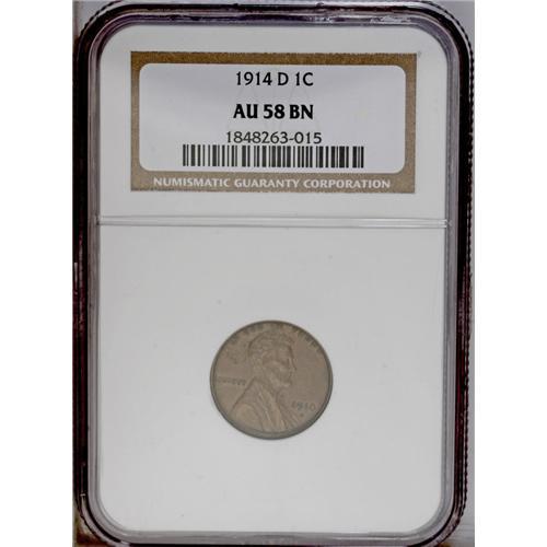 <B>1914-D<1C> AU58 NGC.</B></I> A trace of friction keeps this medium-brown coin from Mint State. Sharply defined and appealing, this piece would make an excellent addition to a high-grade Lincoln cent set.