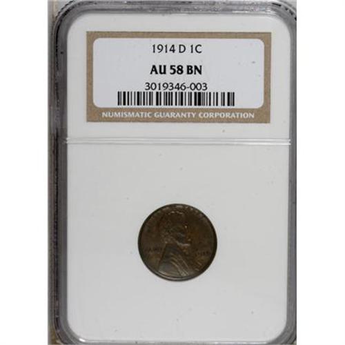 <B>1914-D 1C AU58 NGC.</B></I> The violet-tinged ebony surfaces of this eminently appealing Lincoln key show just a touch of highpoint friction. Carefully preserved otherwise and a coin that likely traded as Mint State in the past.<BR><BR><B>Coin Engraver:</B> Victor D. Brenner<BR><BR><b>Shipping:</b> Coins & Currency (<a target="_blank" href="http://www.heritageauctions.com/common/shipping.php">view shipping information</a>)