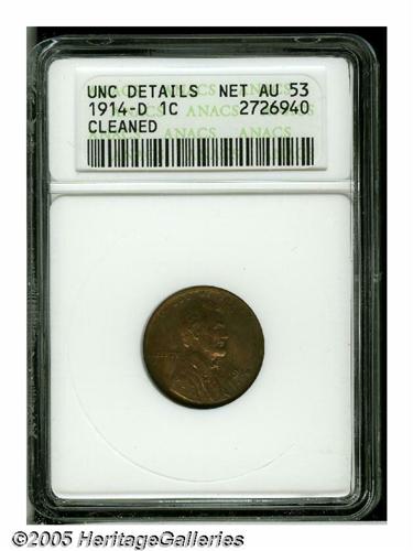 <B>1914-D<1C>--Cleaned--ANACS. Unc Details, Net AU53.</B></I> Lime-green and russet borders surround the straw-gold centers. A recolored and bright key date Cent. Well struck and with no indication of wear.