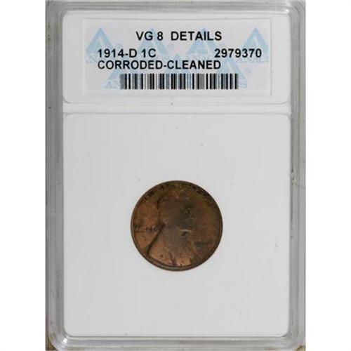 <B>1914-D 1C --Cleaned, Corroded--ANACS. VG8 Details.</B></I> NGC Census: (83/1237). PCGS Population (136/1914). Mintage: 1,193,000. Numismedia Wsl. Price for NGC/PCGS coin in VG8 : $180. (#2471)<BR><BR><b>Shipping:</b> Coins & Currency (<a target="_blank" href="http://www.heritageauctions.com/common/shipping.php">view shipping information</a>)