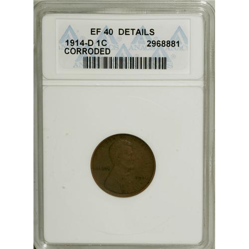 <B>1914-D 1C --Corroded--ANACS. XF40 Details.</B></I> NGC Census: (85/422). PCGS Population (186/508). Mintage: 1,193,000. Numismedia Wsl. Price for NGC/PCGS coin in XF40: $535. (#2471)<BR><BR><b>Shipping:</b> Coins & Currency (<a target="_blank" href="http://www.heritageauctions.com/common/shipping.php">view shipping information</a>)