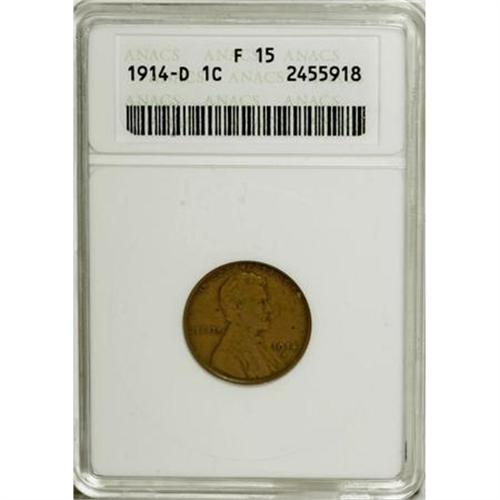 <B>1914-D 1C F15 ANACS.</B></I> NGC Census: (126/945). PCGS Population (208/1522). Mintage: 1,193,000. Numismedia Wsl. Price for NGC/PCGS coin in F15: $338. (#2471)<BR><BR><B>Coin Engraver:</B> Victor D. Brenner<BR><BR><b>Shipping:</b> Coins & Currency (<a target="_blank" href="http://www.heritageauctions.com/common/shipping.php">view shipping information</a>)
