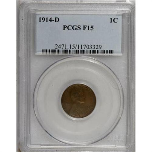<B>1914-D 1C F15 PCGS.</B></I> PCGS Population (203/1482). NGC Census: (126/945). Mintage: 1,193,000. Numismedia Wsl. Price for NGC/PCGS coin in F15: $338. (#2471)<BR><BR><B>Coin Engraver:</B> Victor D. Brenner<BR><BR><b>Shipping:</b> Coins & Currency (<a target="_blank" href="http://www.heritageauctions.com/common/shipping.php">view shipping information</a>)