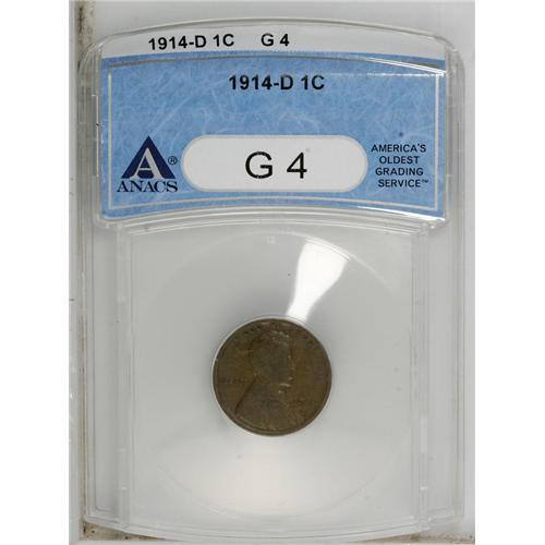<B>1914-D 1C G4 ANACS.</B></I> NGC Census: (99/2383). PCGS Population (26/2049). Mintage: 1,193,000. Numismedia Wsl. Price: $110. (#2471)<BR><BR><b>Shipping:</b> Coins & Currency (<a target="_blank" href="http://www.heritageauctions.com/common/shipping.php">view shipping information</a>)
