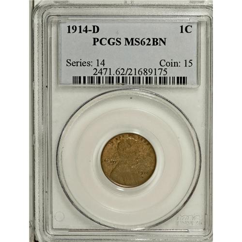 <B>1914-D 1C MS62 Brown PCGS.</B></I> The reverse and the upper left obverse are straw-gold, while most of the lower obverse has toned brown. This exquisitely struck example has silky luster and unabraded surfaces, and is worthy of an exemplary Lincoln cent holding.<BR><BR><b>Shipping:</b> Coins & Currency (<a target="_blank" href="http://www.heritageauctions.com/common/shipping.php">view shipping information</a>)