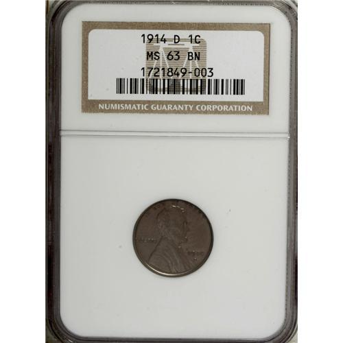 <B>1914-D 1C MS63 Brown NGC.</B></I> Despite a mintage that more than doubles that of the 1909-S VDB, fewer 1914-D cents were saved, and in Mint State grades, the price of a pleasing example outstrips that of its earlier cousin. The glossy walnut-brown surfaces of this solidly struck example are untroubled save for light, scattered abrasions that account for the grade.<BR><BR><b>Shipping:</b> Coin/Currency (<a target="_blank" href="http://www.heritageauctions.com/common/shipping.php">view shipping information</a>)