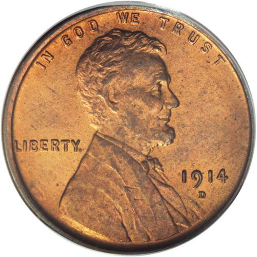 <B>1914-D 1C MS63 Red and Brown PCGS.</B></I> More red than brown, since orange-gold dominates the fields. The portrait highpoints are light cherry-red and steel-blue. Sharply struck and satiny with mark-free surfaces. The low mintage 1914-D has long been a major stumbling block on the path toward completion of a Wheat cent collection.<BR><BR><b>Shipping:</b> Coins & Currency (<a target="_blank" href="http://www.heritageauctions.com/common/shipping.php">view shipping information</a>)