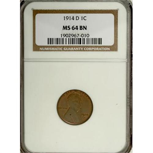 <B>1914-D 1C MS64 Brown NGC.</B></I> A carefully preserved and delightful survivor from this important Lincoln cent issue, well-defined with hints of vivid reddish-orange at the margins of the otherwise violet-brown surfaces. This low-mintage issue was not saved in quantity, and Mint State examples such as the present piece are elusive on the open market. Census: 43 in 64 Brown, 14 finer (3/08).<BR><BR><B>Coin Engraver:</B> Victor D. Brenner<BR><BR><b>Shipping:</b> Coins & Currency (<a target="_blank" href="http://www.heritageauctions.com/common/shipping.php">view shipping information</a>)