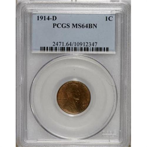 <B>1914-D 1C MS64 Brown PCGS.</B></I> The surfaces of this well struck near-Gem have swaths of olive and sandy-brown, as well as significant areas of slightly faded copper-orange at the reverse periphery. While this low-mintage issue did not attract much contemporary notice, collectors today avidly pursue attractive examples. Population: 40 in 64 Brown, 9 finer (7/07).<BR><BR><B>Coin Engraver:</B> Victor D. Brenner<BR><BR><b>Shipping:</b> Coins & Currency (<a target="_blank" href="http://www.heritageauctions.com/common/shipping.php">view shipping information</a>)
