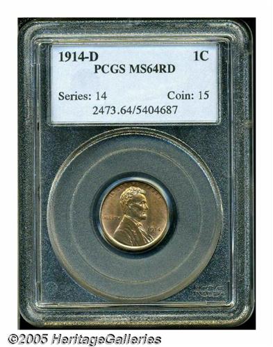 <B>1914-D<1C> MS64 Red PCGS.</B></I> Fully and intricately detailed, the surfaces are bright copper-red with a much better appearance and lighter color than most '14-D Cents. Light muting is noted on the obverse, but contact marks are virtually non-existent. Several degrees of counterclockwise die rotation is also noted. Population: 121 in 64, 54 finer (6/05).