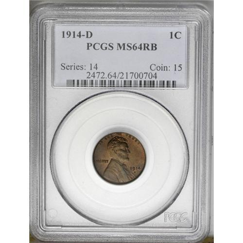 <B>1914-D<1C> MS64 Red and Brown PCGS.</B></I> A key member of the Lincoln cent series, this one is a bit more brown than red, but is still lively overall. The surfaces are clean and free of any notable signs of misfortune, save for a few scattered freckles of carbon on the obverse. Worth a close look and a strong bid.