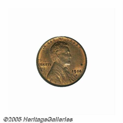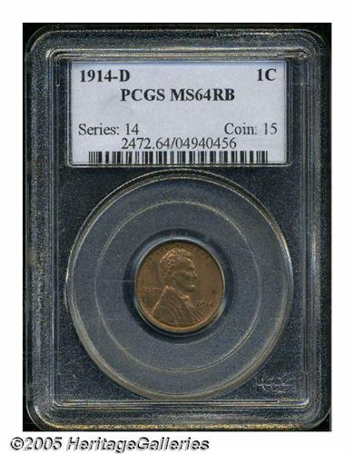 <B>1914-D<1C> MS64 Red and Brown PCGS.</B></I> Few issues in the Lincoln Cent series garner the respect of the 1914-D. From a comparatively low mintage of just under 1.2 million pieces and a reasonably low survival ratio, its scarcity in better Mint State grades is assured. The present near Gem displays mellowing orange coloration and splotches of tan-brown. A few tiny carbon spots are also noted, especially on thee obverse. The design features are generally well impressed. Population: 144 in 64, 31 finer (6/05).