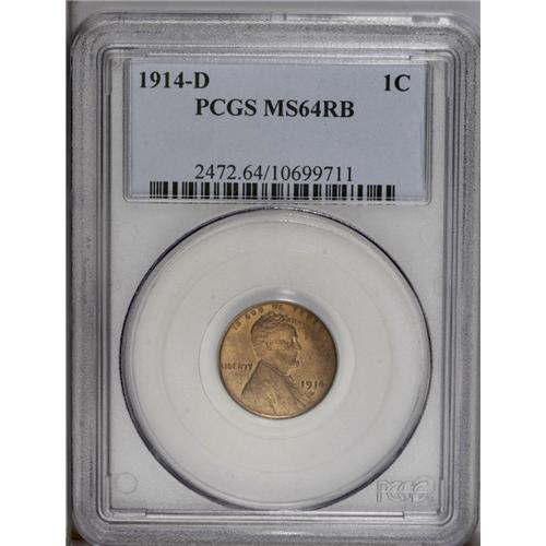 <B>1914-D<1C> MS64 Red and Brown PCGS.</B></I> Full red 1914-D cents are notoriously difficult to locate. Even when found, they usually lack the brightness and vibrancy of other issues from the teens, most notably the 1914-S. Curiously, this coin is close to the traditional understanding of "red" in the Lincoln cent series. There is a bit of brown present around the margins, but the interior portions of each side show remarkably light orange-red color. A few tiny flyspecks of carbon and a couple of small abrasions account for the MS64 grade.