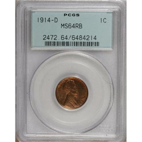 <B>1914-D 1C MS64 Red and Brown PCGS.</B></I> This boldly struck key date cent is impressively free from abrasions, and displays unencumbered satin sheen. The obverse is more red than brown, while the obverse is orange and sea-green along with a prominent blush of deep ruby-red. Certified in an old green label holder.<BR><BR><b>Shipping:</b> Coins & Currency (<a target="_blank" href="http://www.heritageauctions.com/common/shipping.php">view shipping information</a>)
