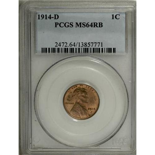 <B>1914-D 1C MS64 Red and Brown PCGS.</B></I> This key date near-Gem Red and Brown representative displays mostly copper-gold luster, imbued with some speckles of light tan. This is an exceptionally well struck example, as most show "slight softening of the numerals and lettering" (David Lange, 2005). A few minute marks limit the grade.<BR><BR><B>Coin Engraver:</B> Victor D. Brenner<BR><BR><b>Shipping:</b> Coins & Currency (<a target="_blank" href="http://www.heritageauctions.com/common/shipping.php">view shipping information</a>)
