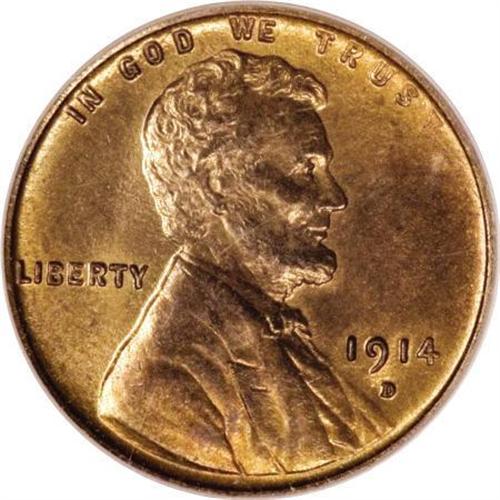 <B>1914-D 1C MS64 Red and Brown PCGS.</B></I> Booming luster and a generous portion of straw-gold confirm the significant quality of this key date cent. Well struck save for the ST in TRUST, and only a solitary fleck above the nose limits the grade. Encapsulated in an old green label holder.<BR><BR><B>Coin Engraver:</B> Victor D. Brenner<BR><BR><b>Shipping:</b> Coins & Currency (<a target="_blank" href="http://www.heritageauctions.com/common/shipping.php">view shipping information</a>)