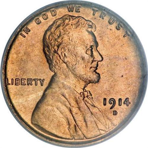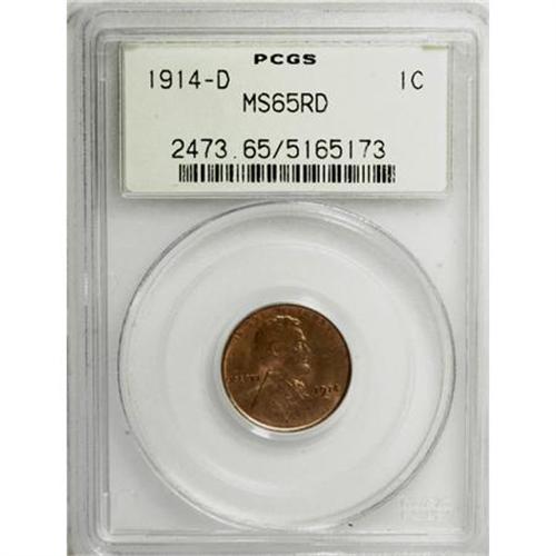 <B>1914-D 1C MS65 Red PCGS.</B></I> The key-date 1914-D is scarce in all circulated grades, and Mint State coins have always been in short supply. David Lange, in his <I>The Complete Guide to Lincoln Cents</B></I>, writes that Gems of any color designation are very scarce, and fully red Gems are rare.<BR> The mint orange surfaces of this MS65 Red example display pleasing luster and sharply defined design elements. Lincoln's hair is crisp, as are all of the lines and grains in the wheat stalks. Close examination reveals no significant contact marks or unsightly spotting. Housed in a green-label holder. Population: 54 in 65 Red, 3 finer (11/07).<BR><BR><B>Coin Engraver:</B> Victor D. Brenner<BR><BR><b>Shipping:</b> Coins & Currency (<a target="_blank" href="http://www.heritageauctions.com/common/shipping.php">view shipping information</a>)