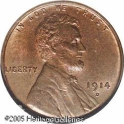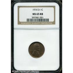 <B>1914-D 1C MS65 Red and Brown NGC.</B></I> Although produced in greater numbers than the 1909-S VDB, the 1914-D (1.2 million pieces struck) was not saved to the same extent. As such, high quality '14-D Cents are actually more challenging than their famous counterpart, and Gems are quite scarce. This boldly struck example retains generous portions of mint red over glossy surfaces and is very well struck. There is little appreciable carbon on the coin and only a small cut on Lincoln's jaw can be construed as a negative. Population: 35 in 65, 4 finer (1/05). Lot:5417