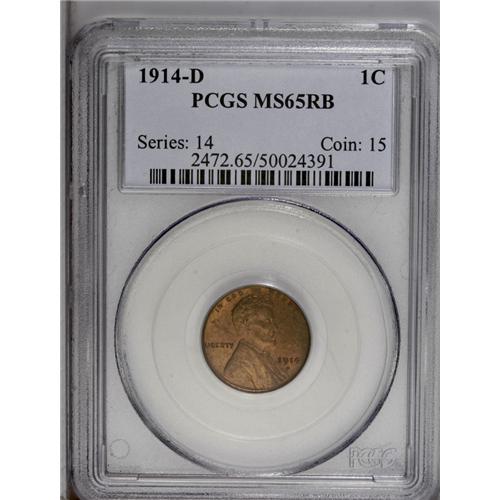 <B>1914-D<1C> MS65 Red and Brown PCGS.</B></I> A sharply struck Gem of this key date, with just a touch too much mellowing to qualify for Red designation, this piece nonetheless offers nearly full red on the reverse, with about 50:50 red and brown on the obverse. A couple of tiny toning flecks seen only under a loupe are undistracting, and this piece is as nice as they come without obtaining a full Red Gem at a much higher price. Population: 31 in 65 Red and Brown, 0 finer (7/06).
