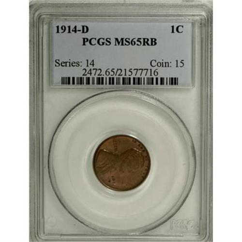 <B>1914-D 1C MS65 Red and Brown PCGS.</B></I> While the 1909-S VDB and 1931-S are lower-mintage Lincoln cents, no issue from that series is so elusive in Mint State as the 1914-D, which was little-saved at the time of release and not appreciated as a key until decades later. This beautifully preserved Gem example offers pleasing detail for the issue, though slight hints of softness appear at the margins. Each side offers a blend of light olive-tan and copper-gold shadings, and in the reverse fields, elements of peach also appear. Population: 36 in 65 Red and Brown, 0 finer (3/08).<BR><BR><B>Coin Engraver:</B> Victor D. Brenner<BR><BR><b>Shipping:</b> Coins & Currency (<a target="_blank" href="http://www.heritageauctions.com/common/shipping.php">view shipping information</a>)