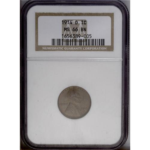 <B>1914-D<1C> MS66 Brown NGC.</B></I> A sharply impressed coin that has wonderfully crisp detail on the peripheral lettering and devices. Toned dark brown with blue accents in the fields, and pleasing. There is a hint of a faded spot behind Lincoln's head, but only a trace is present. Certainly one of the finer examples of this date to survive, and the present coin has both strong eye appeal and the desirable sharpness to the strike. Census: 2 in 66, 0 finer (1/06).