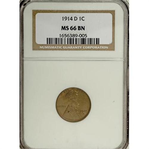 <B>1914-D 1C MS66 Brown NGC.</B></I> A sharply impressed key-date coin that has wonderfully crisp detail on the peripheral lettering and central devices. The richly lustrous olive-brown surfaces show occasional undercurrents of blue and mahogany. This magnificently preserved survivor, one of fewer than 1.2 million pieces struck, ranks among the finest examples available to collectors today. Census: 2 in 66 Brown, 0 finer (3/08).<BR><BR><B>Coin Engraver:</B> Victor D. Brenner<BR><BR><b>Shipping:</b> Coins & Currency (<a target="_blank" href="http://www.heritageauctions.com/common/shipping.php">view shipping information</a>)
