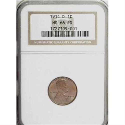 <B>1914-D 1C MS66 Red NGC.</B></I> The 1914-D was better struck than the Denver issues of 1911-1913, and this is an especially sharp example with crisp definition on Lincoln's beard and coat, and all lettering on both obverse and reverse.<BR> Only 1.193 million cents were struck in Denver in 1914, and it was recognized as a key issue in the Lincoln series as early as the 1930s. The '14-D is an issue that is also difficult to locate with fully lustrous surfaces. In addition to reddish-tan coloration, this lovely coin displays smooth surfaces that ensure its status as one of the most desirable survivors available to advanced specialists. The strike is razor-sharp throughout and every feature rises powerfully above the fields.<BR><I>From The New York Eye Appeal Collection, Part Three.</B></I><BR><BR><B>Coin Engraver:</B> Victor D. Brenner<BR><BR><b>Shipping:</b> Coins & Currency (<a target="_blank" href="http://www.heritageauctions.com/common/shipping.php">view shipping information</a>)