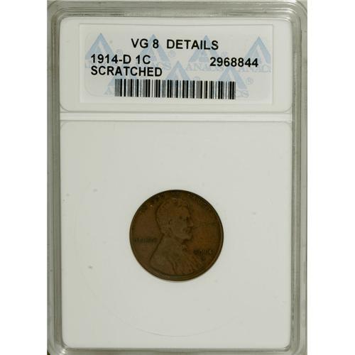 <B>1914-D 1C --Scratched--ANACS. VG8 Details.</B></I> NGC Census: (0/59). PCGS Population (1/229). Mintage: 1,193,000. (#2473)<BR><BR><b>Shipping:</b> Coins & Currency (<a target="_blank" href="http://www.heritageauctions.com/common/shipping.php">view shipping information</a>)