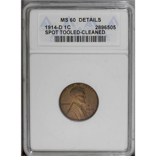 <B>1914-D<1C>--Spot Tooled, Cleaned--ANACS. MS60 Details.</B></I> Nicely struck with no trace of wear, though a dark spot in the right obverse field has been tooled. The surfaces are pinkish-brown, an indication of cleaning.