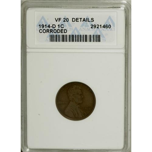 <B>1914-D 1C --Corroded--ANACS. VF20 Details.</B></I> NGC Census: (368/1240). PCGS Population (191/1180). Mintage: 1,193,000. Numismedia Wsl. Price: $300. (#2471)<BR><BR><b>Shipping:</b> Coin/Currency (<a target="_blank" href="http://www.heritageauctions.com/common/shipping.php">view shipping information</a>)