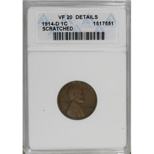 <B>1914-D 1C --Scratched--ANACS. VF20 Details.</B></I> NGC Census: (98/903). PCGS Population (225/1362). Mintage: 1,193,000. Numismedia Wsl. Price for NGC/PCGS coin in VF20: $370. (#2471)<BR><BR><B>Coin Engraver:</B> Victor D. Brenner<BR><BR><b>Shipping:</b> Coins & Currency (<a target="_blank" href="http://www.heritageauctions.com/common/shipping.php">view shipping information</a>)