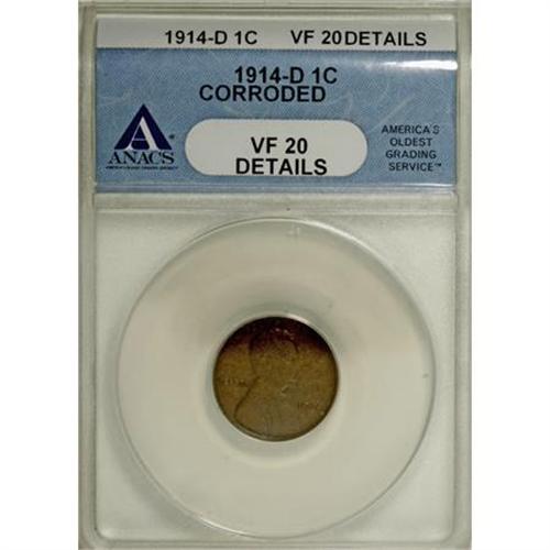 <B>1914-D 1C --Corroded--ANACS. VF20 Details.</B></I> NGC Census: (103/911). PCGS Population (231/1391). Mintage: 1,193,000. Numismedia Wsl. Price for NGC/PCGS coin in VF20: $380. (#2471)<BR><BR><B>Coin Engraver:</B> Victor D. Brenner<BR><BR><b>Shipping:</b> Coins & Currency (<a target="_blank" href="http://www.heritageauctions.com/common/shipping.php">view shipping information</a>)