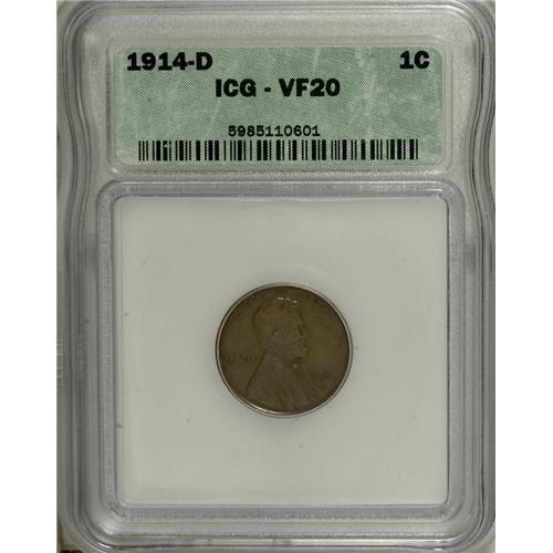 <B>1914-D 1C VF20 ICG.</B></I> NGC Census: (0/59). PCGS Population (2/225). Mintage: 1,193,000. (#2473)<BR><BR><b>Shipping:</b> Coin/Currency (<a target="_blank" href="http://www.heritageauctions.com/common/shipping.php">view shipping information</a>)