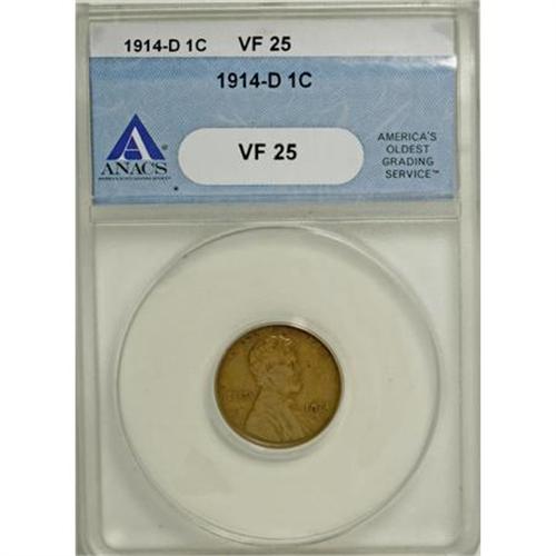 <B>1914-D 1C VF25 ANACS.</B></I> NGC Census: (121/768). PCGS Population (172/1166). Mintage: 1,193,000. Numismedia Wsl. Price for NGC/PCGS coin in VF25: $404. (#2471)<BR><BR><B>Coin Engraver:</B> Victor D. Brenner<BR><BR><b>Shipping:</b> Coins & Currency (<a target="_blank" href="http://www.heritageauctions.com/common/shipping.php">view shipping information</a>)