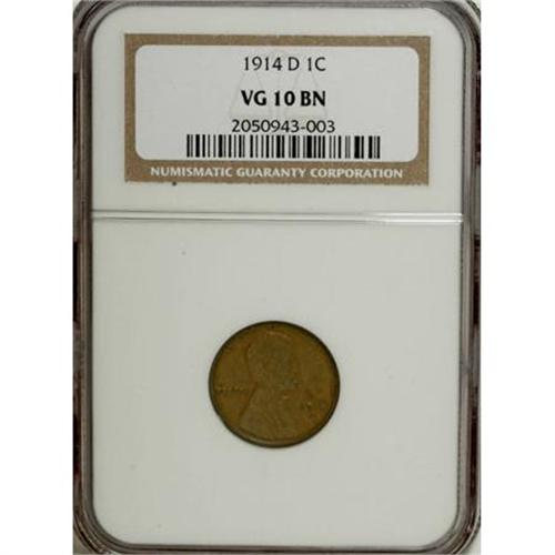 <B>1914-D 1C VG10 NGC.</B></I> NGC Census: (89/1188). PCGS Population (190/1912). Mintage: 1,193,000. Numismedia Wsl. Price for NGC/PCGS coin in VG10: $242. (#2471)<BR><BR><B>Coin Engraver:</B> Victor D. Brenner<BR><BR><b>Shipping:</b> Coins & Currency (<a target="_blank" href="http://www.heritageauctions.com/common/shipping.php">view shipping information</a>)