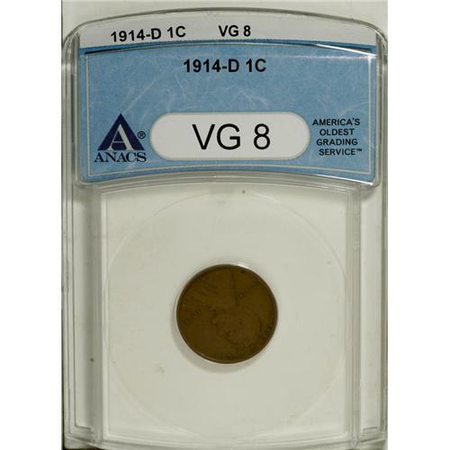 <B>1914-D 1C VG8 ANACS.</B></I> NGC Census: (159/2234). PCGS Population (98/1870). Mintage: 1,193,000. Numismedia Wsl. Price for NGC/PCGS coin in VG8 : $155. (#2471)<BR><BR><b>Shipping:</b> Coins & Currency (<a target="_blank" href="http://www.heritageauctions.com/common/shipping.php">view shipping information</a>)