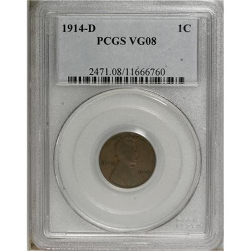 <B>1914-D 1C VG8 PCGS.</B></I> PCGS Population (136/1914). NGC Census: (83/1237). Mintage: 1,193,000. Numismedia Wsl. Price for NGC/PCGS coin in VG8 : $180. (#2471)<BR><BR><b>Shipping:</b> Coins & Currency (<a target="_blank" href="http://www.heritageauctions.com/common/shipping.php">view shipping information</a>)