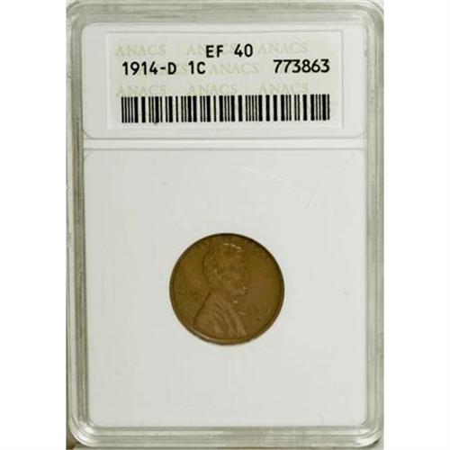 <B>1914-D 1C XF40 ANACS.</B></I> NGC Census: (89/453). PCGS Population (195/555). Mintage: 1,193,000. Numismedia Wsl. Price for NGC/PCGS coin in XF40: $615. (#2471)<BR><BR><B>Coin Engraver:</B> Victor D. Brenner<BR><BR><b>Shipping:</b> Coins & Currency (<a target="_blank" href="http://www.heritageauctions.com/common/shipping.php">view shipping information</a>)