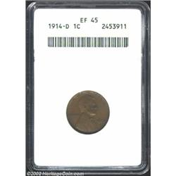 1914-D 1C XF45 ANACS. A very smooth, chocolate-brown example of this key date cent. Even close examination reveals no post-striking detractions. Worthy of a premium bid. Important notice: We expect to be auctioning lots at the rate of 200-250 per hour. Sometimes eBay Premier live bid software cannot keep up with that pace, so we strongly recommend that you place a realistic proxy bid now as insurance to avoid disappointment. Also please note that all Heritage/CAA lots purchased through eBay Premier carry a 20% Buyer's Premium. Please make sure you read the Terms and Conditions.