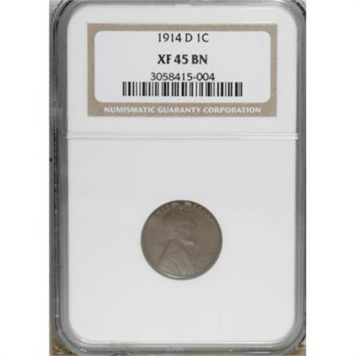 <B>1914-D 1C XF45 NGC.</B></I> NGC Census: (116/342). PCGS Population (179/378). Mintage: 1,193,000. Numismedia Wsl. Price for NGC/PCGS coin in XF45: $776. (#2471)<BR><BR><B>Coin Engraver:</B> Victor D. Brenner<BR><BR><b>Shipping:</b> Coins & Currency (<a target="_blank" href="http://www.heritageauctions.com/common/shipping.php">view shipping information</a>)