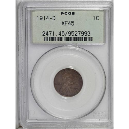 <B>1914-D<1C> XF45 PCGS.</B></I> Medium olive-brown surfaces with traces of lighter tan color on the devices. Remnants of removable verdigris are evident around portions of the design motifs and inside a few of the letters. An ever-popular key-date issue.