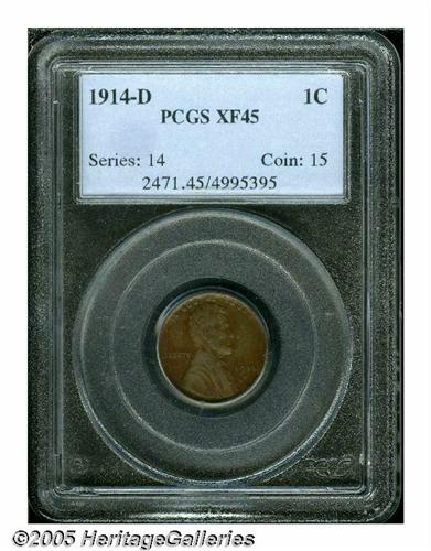 <B>1914-D<1C> XF45 PCGS.</B></I> This key date example takes on reddish-brown patina on the obverse, while the reverse is more of a golden-brown. The present coin is a pleasing, clean specimen that reveals great definition on the design elements, and will fit comfortably into a high grade circulated Lincoln cent collection.
