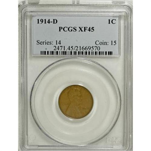 <B>1914-D 1C XF45 PCGS.</B></I> A pleasing example of this key date, which is recognized by many numismatists as being scarcer than the famous 1909-S VDB at most grade levels. This Choice XF piece is well detailed and mildly worn, with a few small marks on the reverse. <BR><BR><B>Coin Engraver:</B> Victor D. Brenner<BR><BR><b>Shipping:</b> Coins & Currency (<a target="_blank" href="http://www.heritageauctions.com/common/shipping.php">view shipping information</a>)
