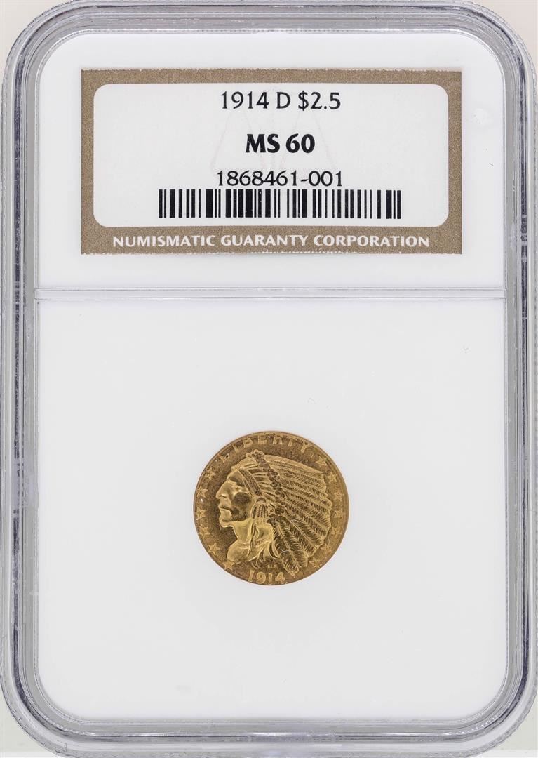One 1914-D $2 1/2 Indian Head Quarter Eagle Gold Coin NGC MS60. NGC Certified.