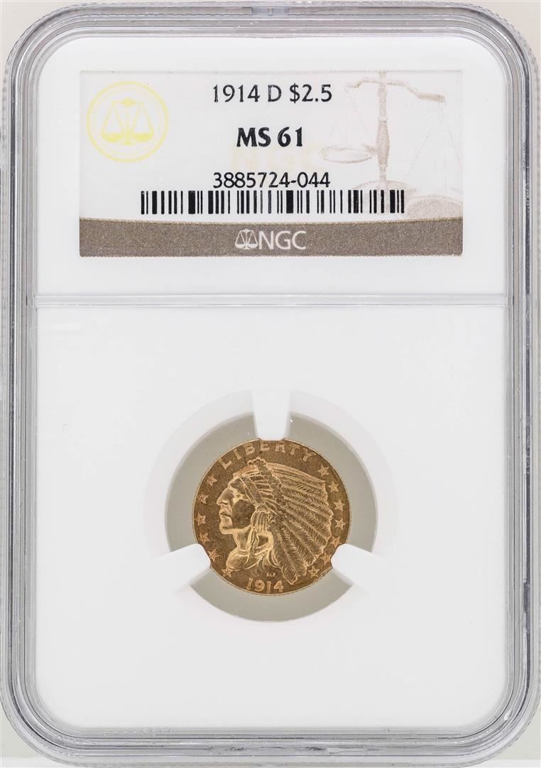 One 1914-D $2 1/2 Indian Head Quarter Eagle Gold Coin NGC MS61. NGC Certified.
