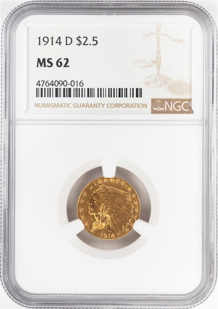 One 1914-D $2 1/2 Indian Head Quarter Eagle Gold Coin NGC MS62. NGC Certified.