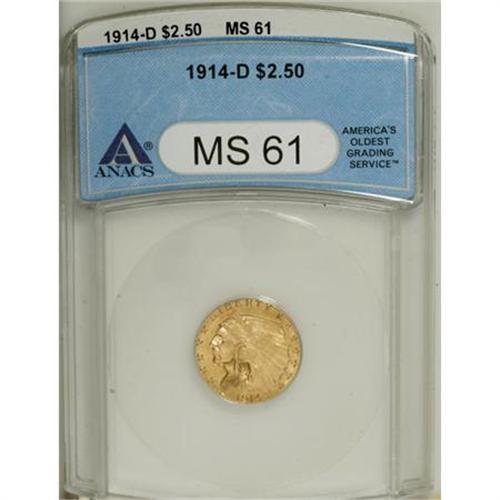 <B>1914-D $2 1/2 MS61 ANACS.</B></I> NGC Census: (1411/4148). PCGS Population (428/2401). Mintage: 448,000. Numismedia Wsl. Price for NGC/PCGS coin in MS61: $380. (#7947)<BR><BR><b>Shipping:</b> Coins & Currency (<a target="_blank" href="http://www.heritageauctions.com/common/shipping.php">view shipping information</a>)